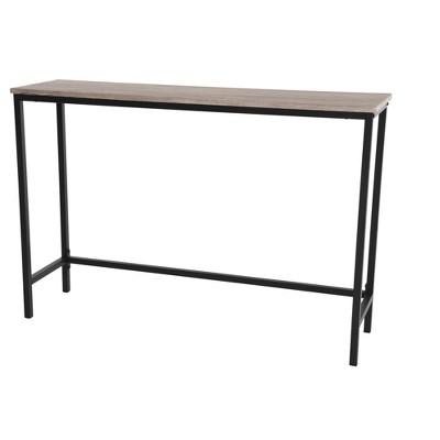 This Sauder console table is ideal for placing a house plant ornament framed picture or other small items on top of. It features a black metal frame construction for durability and strength and a charter oak finish on all sides. This console table features a spacious top surface that provides you with the perfect amount of space to highlight your important items.